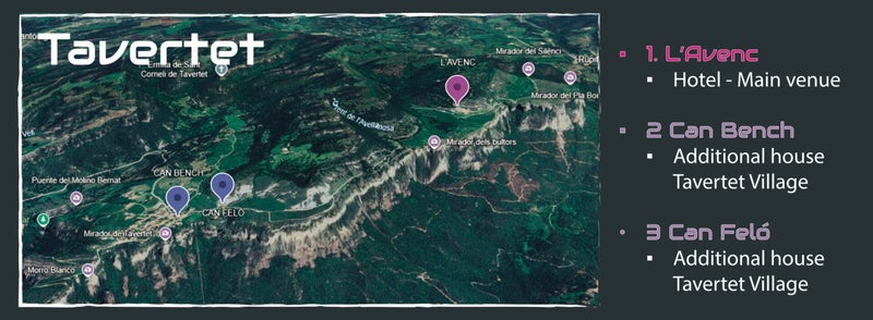 The secondary house, Can Bench, is located in the village, about a 7-minute drive from the main hotel (3 km). The road between L’Avenc and Tavertet is spectacular, offering privileged views of the cliffs, making the short journey itself a beautiful experience. Transportation will be available to connect both locations.